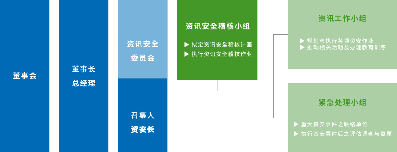 稽核室则负责检视风险管理机制的执行情形,并定期向审计委员会及董事会报告,确保风险治理透明且持续优化。