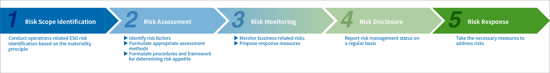 | Dynamic monitoring of risk trends | With reference to GRI, COSO, and other risk management standards, we implement data monitoring and external analysis mechanisms to identify emerging risk scenarios and improve the foresight and effectiveness of our ESG risk management. |